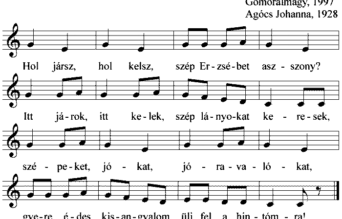 A gyűjtő, Sallai Ágnes ezt írja az alábbi dalról: „Ez alábbi játékdalt hasonlóan énekelték Almágyban és Hidegkúton. (Némi szövegbeli eltérés...