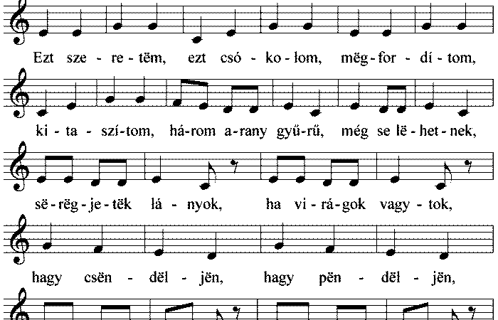 1. Szép asszony szőribül, Vén leány bőribül, Nincsen az a suszter, varga, Aki nékem cipőt varrna. Pénteken, szombaton. 2. Igyál...