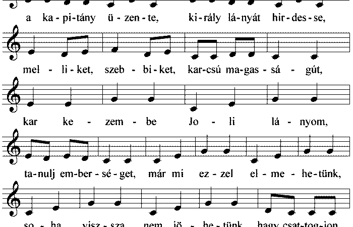 1. Szépen mëgy a gőzhajó a vízen, Szépen legel a lovam a réten, Szépen szól a csengő a nyakábo, Tijed...