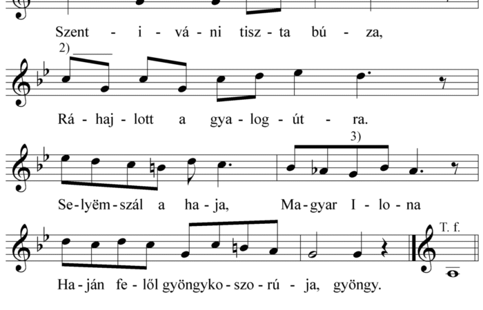 1. Szentiváni tiszta búza, Ráhajlott a gyalogútra. Selyëmszál a haja, Magyar Ilona, Haján felől gyöngykoszorúja, gyöngy. 2. Ëgyik ága hajlik...