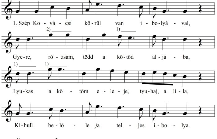 1. Szép Kovácsi körül van ibolyával, Gyere, rózsám, tëdd a kötőd aljába, Lyukas a kötőm eleje, tyuhaj, a lila, Kihull belőle ja teljes...