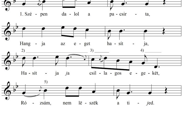1. Szépen dalol a pacsirta, Hangja az eget hasítja, Hasítja ja csillagos egekët, Rózsám, nem lëszëk a tijed. 2. Mëgmondtam nekëd gërlice,...