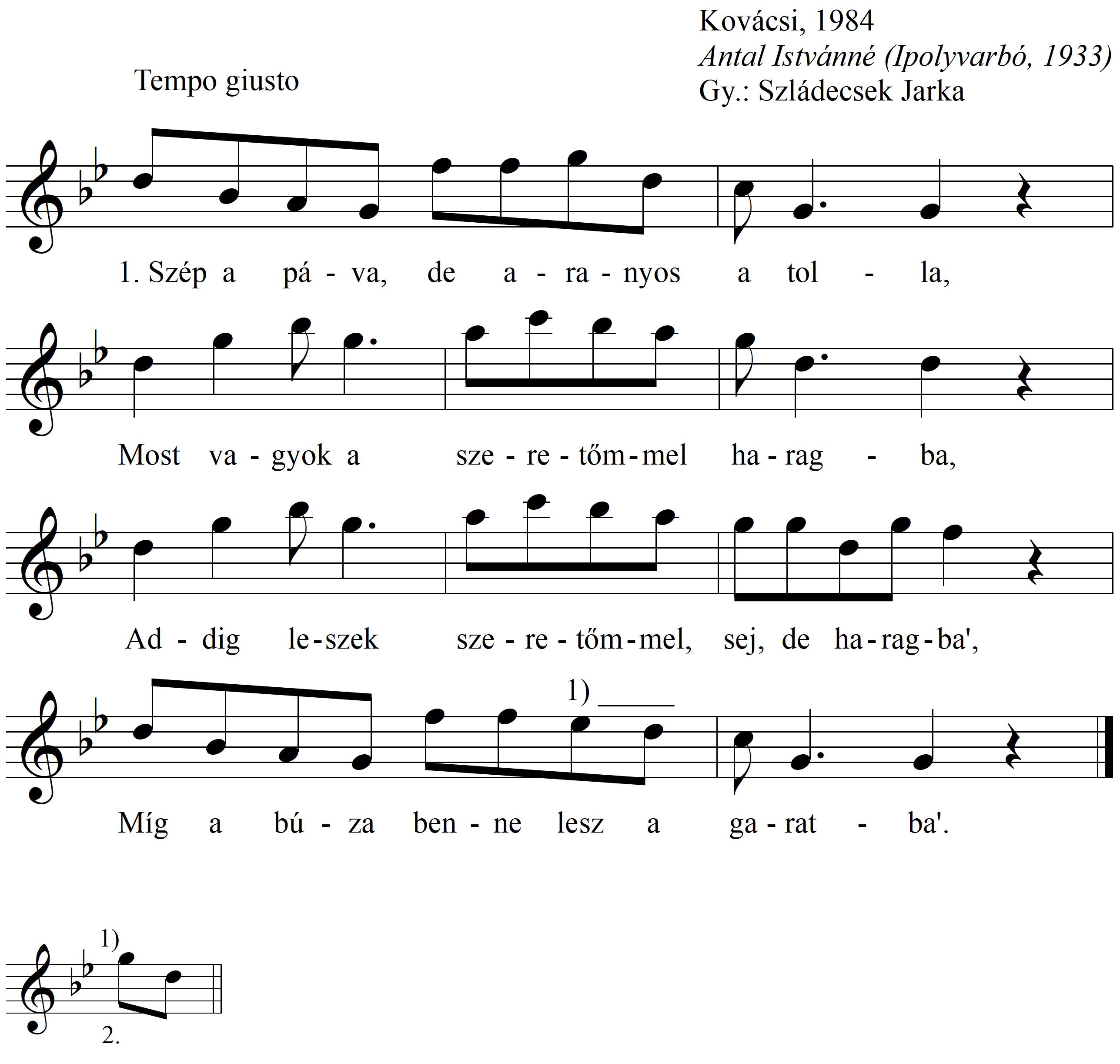 1. Szép a páva, de aranyos a tolla, Most vagyok a szeretőmmel haragba, Addig leszek szeretőmmel, sej, de haragba‘, Míg...