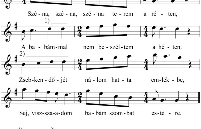1. Széna, széna, széna terem a réten, A babámmal nem beszéltem a héten. Zsebkendőjét nálom hatta emlékbe, Sej, visszaadom babám...
