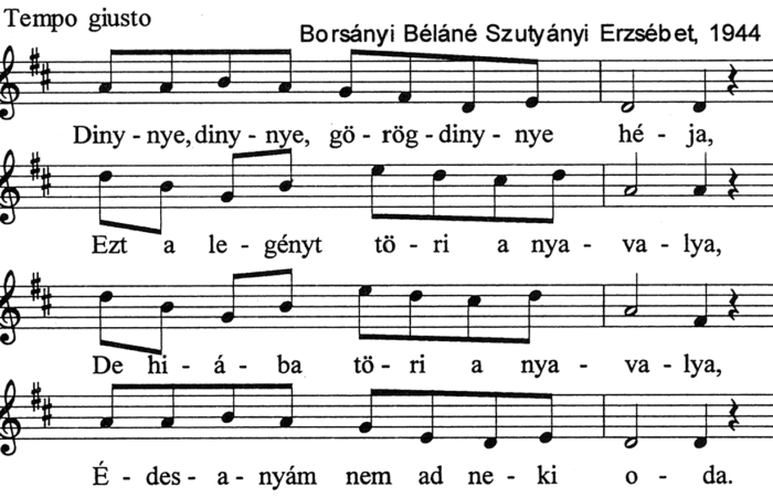 1. Dinnye, dinnye, görögdinnye héja,Ezt a legényt töri a nyavalya,De hiába töri a nyavalya,Édes anyám nem ad neki oda.2. Kislány,...