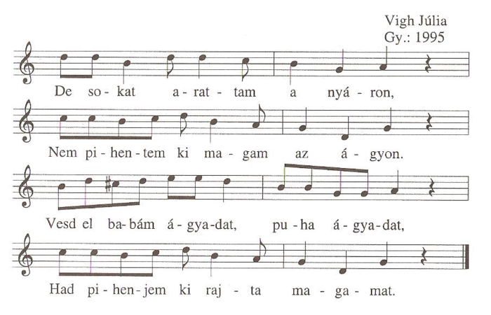 De sokat arattam a nyáron,Nem pihentem ki magam az ágyon.Vesd el babám ágyadat, puha ágyadat,Had pihenjem ki rajta magamat.