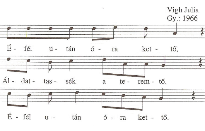 Éfél után óra kettő,Áldattassék a teremtő.Éfél után óra kettő.