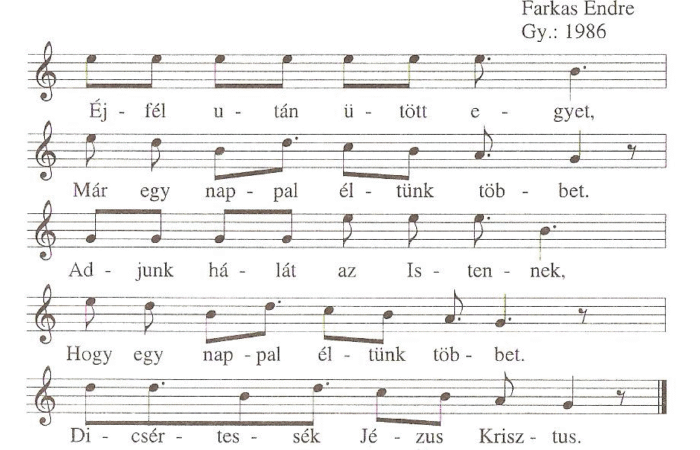 Éjfél után ütött egyet,Már egy nappal éltünk többet.Adjunk hálát az Istennek,Hogy egy nappal éltünk többet.Dicsértessék Jézus Krisztus.