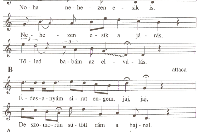 A. El kell menni, ha esik is,Noha nehezen esik is. Nehezen esik a járás,Tőled babám az elválás.B. Édesanyám sirat engem,...