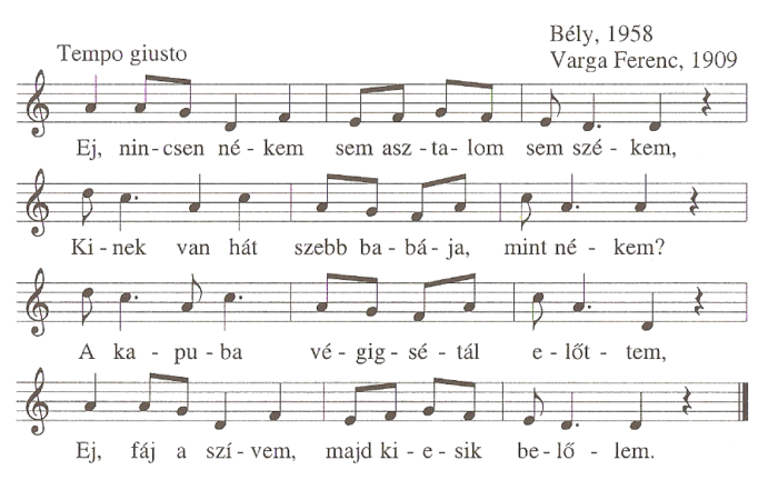 1. Ej, nincsen nékem sem asztalom sem székem,Kinek van hát szebb babája, mint nékem?A kapuba végigsétál előttem,Ej, fáj a szívem...