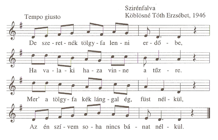 1. De szeretnék tölgyfa lenni erdőbe,Ha valaki haza vinne  tűzre.Mer a tölgyfa kék lánggal ég, füst nélkül,Az én szívem soha...