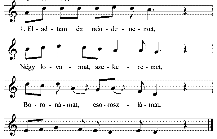 1. Eladtam én mindenemet, Négy lovamat, szekeremet, Boronámat, csoroszlámat, Kilenc lukú furulámat. 2. Eladtam én mindenemet, |: Hogy szőlőpásztor lehessek....