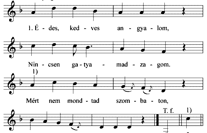 1. Édes, kedves angyalom, Nincsen gatyamadzagom, Mért nem mondtad szombaton, Vettem vóna Gyarmaton. 2. Vëttem volna, dë nem vót, Nem...