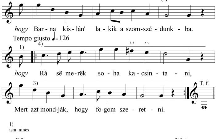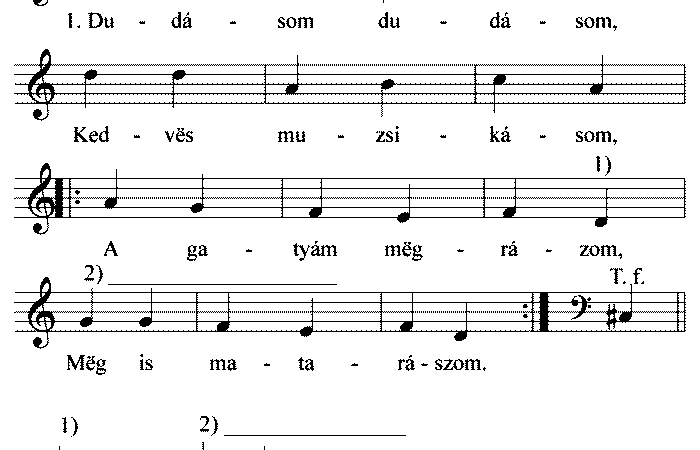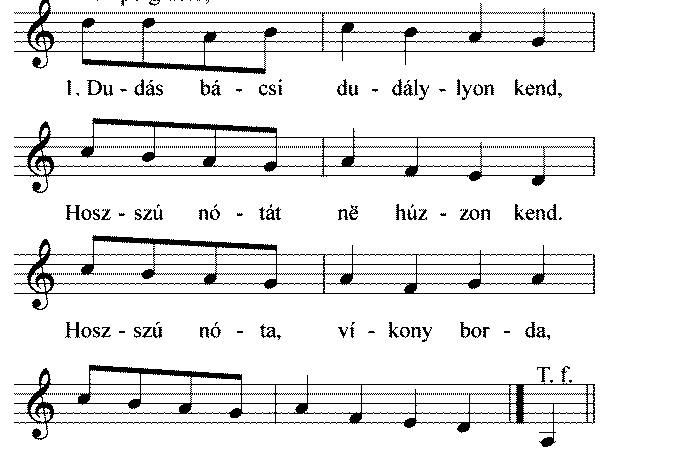 1. Dudás bácsi dudállyon kend, Hosszú nótát ne húzzon kend. Hosszú nóta, víkony borda, No te Ancsa fordúj vissza. 2....