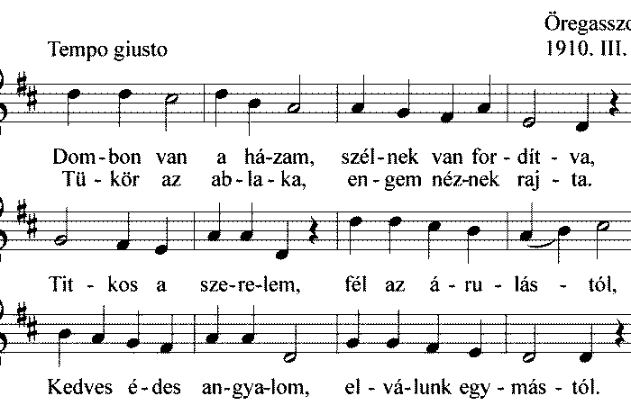 1. Dombon van a házam, szélnek van fordítva, Tükör az ablaka, engem néznek rajta. Titkos a szerelem, fél az árulástól, Kedves...