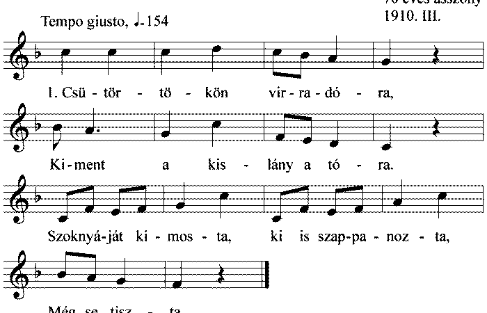 1. Csütörtökön virradóra, Kiment a kislány a tóra. Szoknyáját kimosta, ki is szappanozta, Mégse tiszta. 2. Elvitte a víz a...