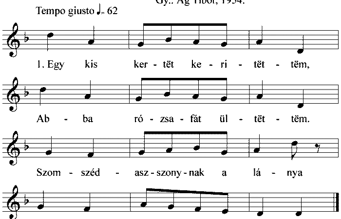 1. Egy kis kertët keritëttëm, Abba rózsafát ültëttëm, Szomszéd asszonynak a lánya, Rákapott a rózsafámra. 2. Mikor én aztot mëgtudtam,...
