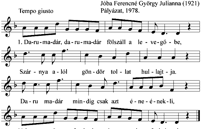 1. Darumadár, darumadár fölszáll a levegőbe, Szárnya alól göndör tollát hullajtja. Darumadár mindig csak azt éne-énekeli, Volt szeretőm a faluba,...