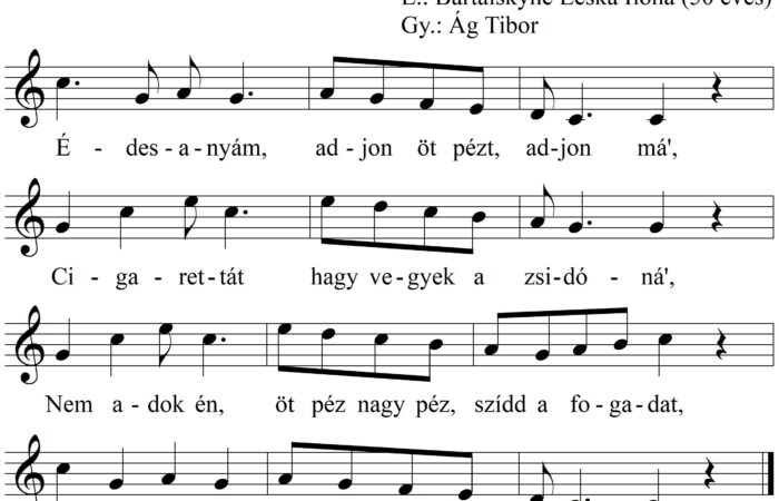 1. – Édesanyám, adjon öt pézt, adjon má’, Cigarettát hagy vegyek a zsidóná’. – Nem adok én, öt péz nagy...
