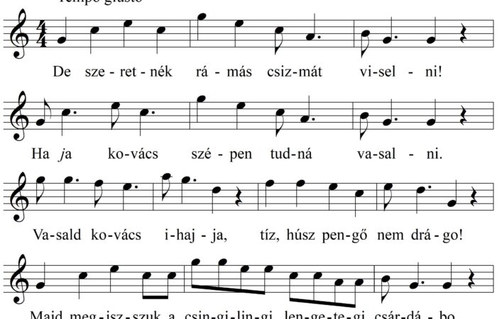 1. De szeretnék rámás csizmát viselni! Ha ja kovács szépen tudná vasalni. Vasald kovács, ihajja, tíz, húsz pengő nem drágo!...