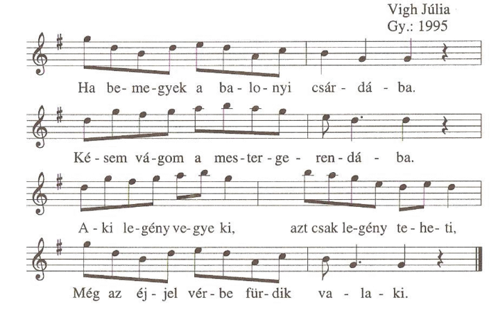 Ha bemegyek a balonyi csárdába.Késem vágom a mestergerendába.Aki legény vegye ki, azt csak legény teheti,Még az éjjel vérbe fürdik valaki.