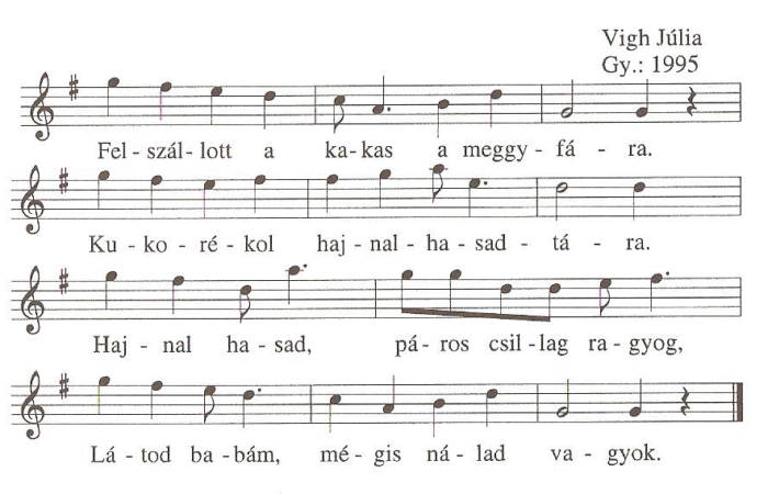 Felszállott a kakas a meggyfára.Kukorékol hajnal hasadtára.Hajnal hasad, páros csillag ragyog,Látod babám. mégis nálad vagyok.