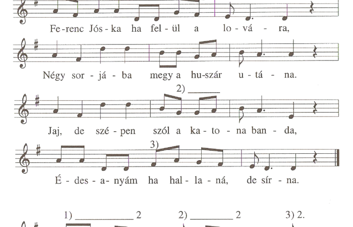 1. Ferenc Jóska, ha felül a lovára,Négy sorjába megy a huszár utána.Jaj, de szépen szól a katona banda,Édesanyám hallaná, de...