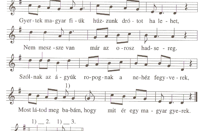 1. Gyertek magyar fiúk húzunk drótot ha lehet,Nem messze van már az ország hadserege.Szólnak az ágyúk ropognak a nehéz fegyverek,Most...