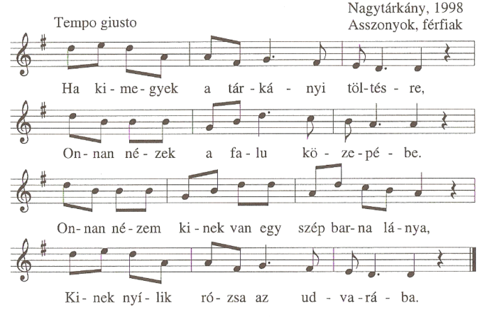 1. Ha kimegyek a tárkányi töltésre,Onnan nézek a falu közepére,Onnan nézem kinek van egy szép barna lánya,Kinek nyílik rózsa az...