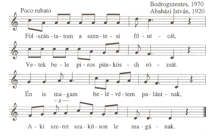 1. Fölszántatom a szentesi főutcát,Vetek bele piros pünkösdi rózsát.Én is magam belévétem palántnak,Aki szeret szakítson le magának.2. Ágas-bogas a diófa...