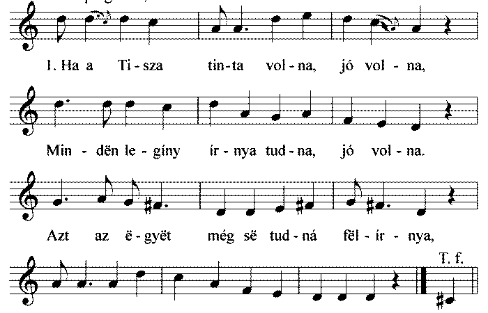 1. Ha a Tisza tinta volna, Minden legíny írnya tudna, jó volna. Azt az egyet még se tudná felírnya, Kit...