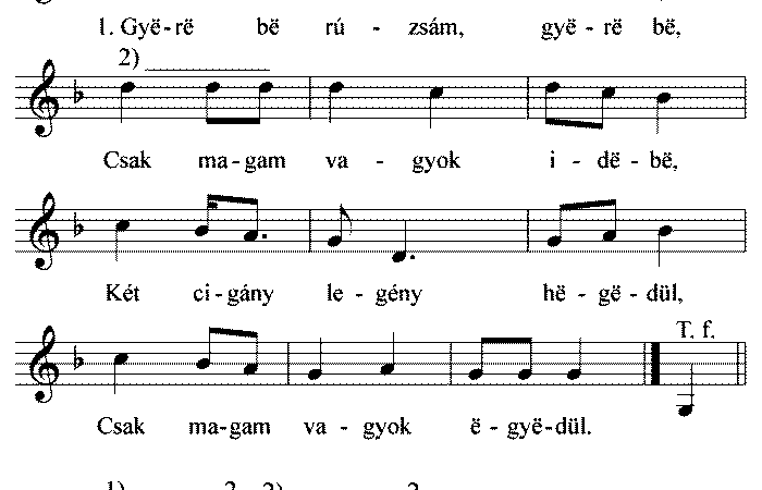 1. Gyere be rúzsám, gyere be, Csak magam vagyok idebe, Két cigány legény hegedül, Csak magam vagyok egyedül. 2. Nëm...