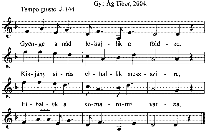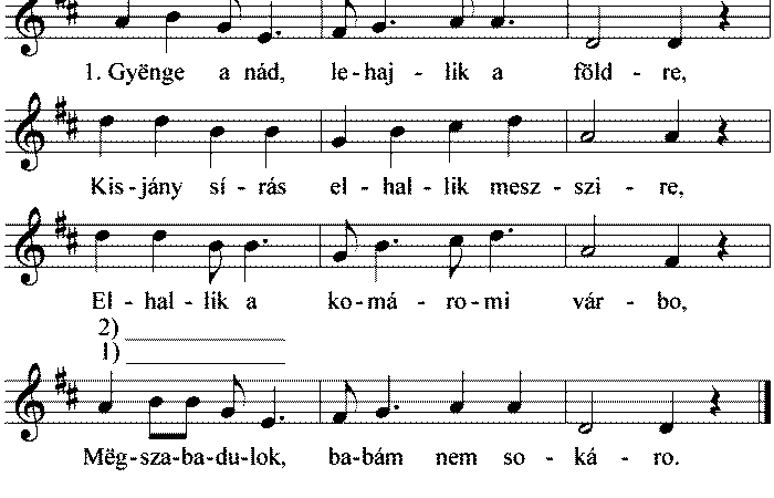1. Gyënge a nád, lëhajlik a földre, Kisjány sirás elhallik messzire, Elhallik a komáromi várba, Mëgszabadulok, babám, nemsokára.