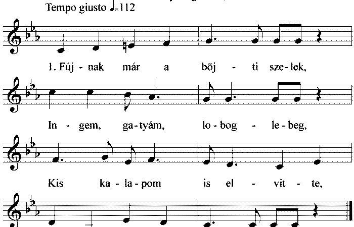 1. Fújnak már a bőjti szelek, Ingem, gatyám, lobog, lebeg, Kis kalapom is elvitte, A Tiszába bé vetette. 2. Én...