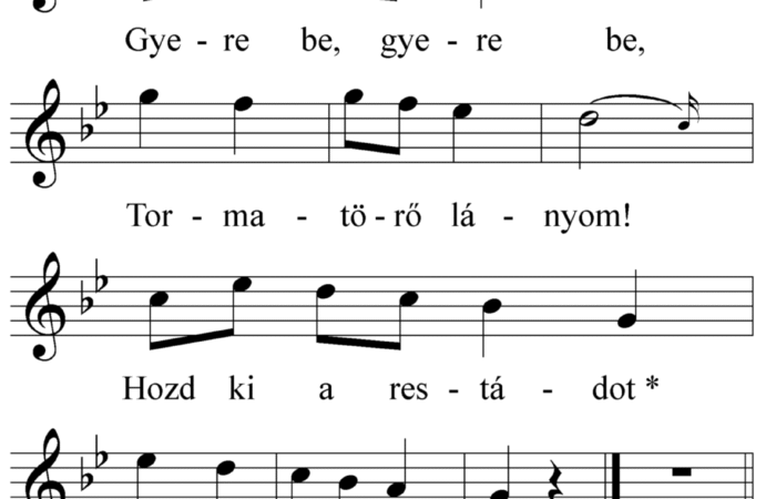 Gyere be, gyere be, Tormatörő lányom! Hozd ki a restádot Vidd bë a virágot!