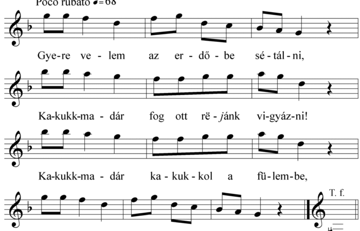 1. Gyere velem az erdőbe sétálni, Kakukkmadár fog ott rëjánk vigyázni! Kakukkmadár kakukkol a fülembe, Të mëg rózsám gyere ülj az...