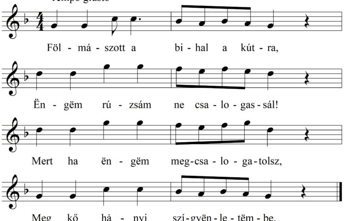 1. Fölmászott a bihal a kútra, Ëngëm rúzsám ne csalogassál! Mert ha ëngëm megcsalogatolsz, Meg kő hanyi szígyënletëmbe.