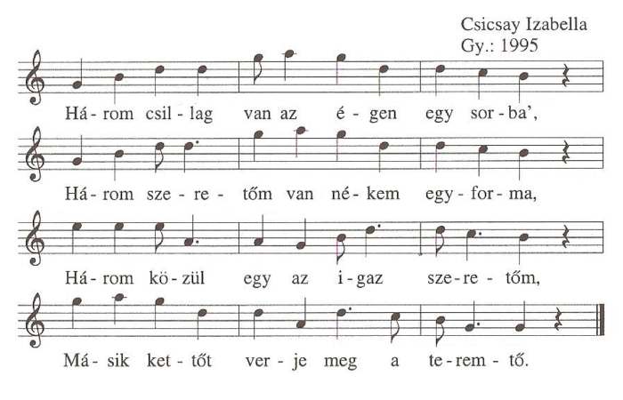 Három csillag van az égen egy sorba,Három szeretőm van nékem egyforma.Három közül egy az igaz szeretőm,Másik kettőt verje meg a...