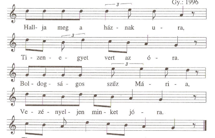 Hallja meg a háznak ura,Tizenegyet vert az óra,Boldogságos szűz Mária,Vezényeljen minket jóra.Tizenegyet vert az óra.