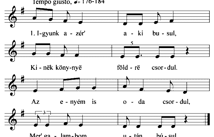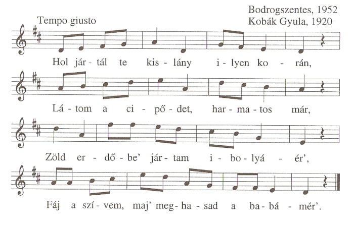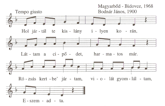 1. Hol jártál te kislány ilyen korán,Láttam a cipődet, harmatos már.Rózsás kerte' jártam, violát gyomláltam,Eszemadta.  2. Hoztál-e violát a számomra?Hagy...