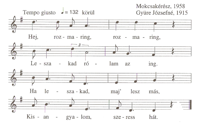 1. Hej, rozmaring, rozmaring,Leszakad rólam az ing.Ha leszakad, maj' lesz más,Kisangyalom szeress hát.2. Marcsa, Marcsa, hol jártál,Talán kendert áztattál?Hazajöttél vizesen,Adtál...