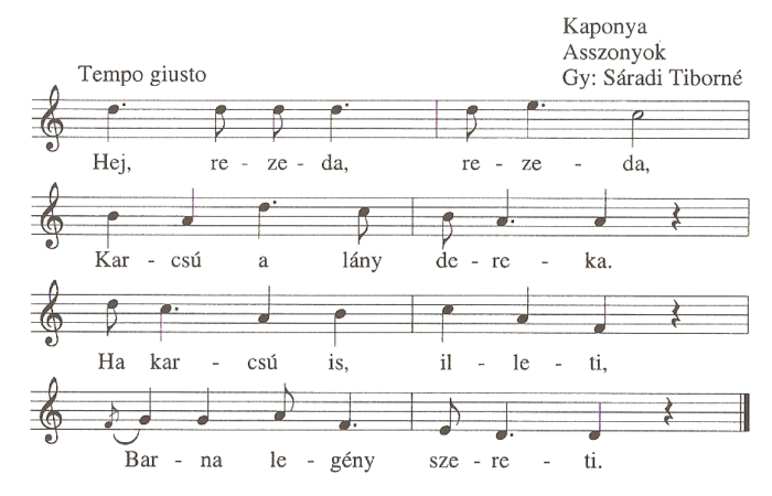1. Hej, rezeda, rezeda,Karcsú a lány dereka.Ha karcsú is, illeti,Barna legény szereti.2. Hej szegfűszeg, szegfűszeg,A legénynek nem hiszek.Mert a legény...