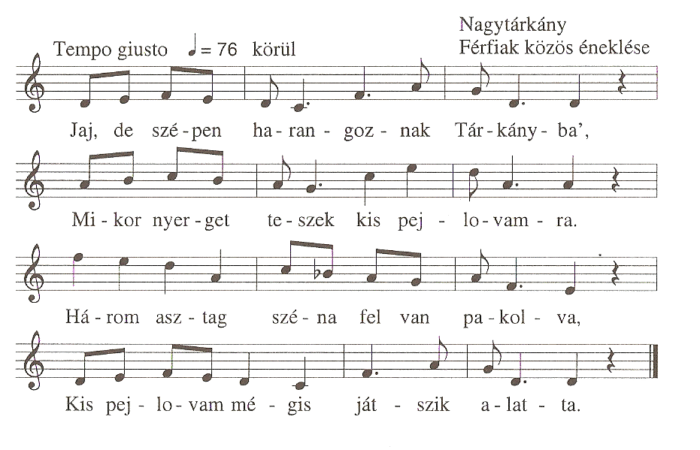 1. Jaj, de szépen harangoznak Tárkányba,Mikor nyerget teszek kis pej lovamra.Három asztag széna fel van pakolva,Kis pej lovam mégis játszik...