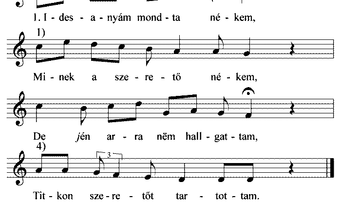 1. Idesanyám mondta nékem, Minek a szerető nékem, De jén arra nem hallgattam, Titkon szeretőt tartottam. 2. Titkon szeretni nem...
