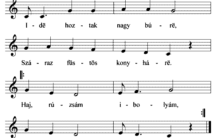 1. Ide hoztak nagy búre, Száraz füstös konyháre. Haj, rúzsám ibolyám, Csókód meg az arcám. Csókód mëg az arcám, Százszor...