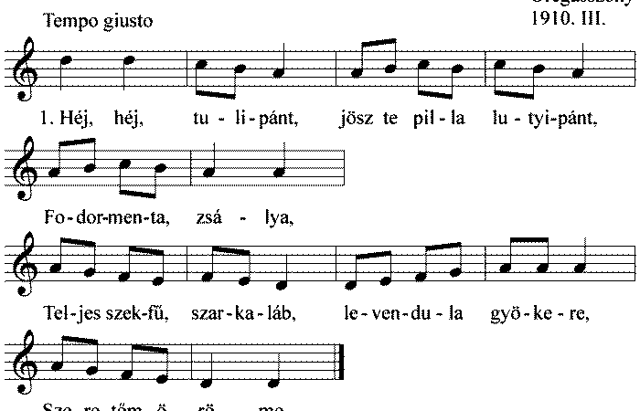 1. Héj, héj, tulipánt, jösz te pilla lutyipánt, Fodormenta, zsálya, Teljes szekfű, szarkaláb, levendula gyökere, Szeretőm öröme. 2. Héj, héj,...