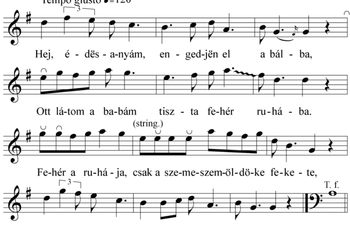 Hej, édësanyám engedjën el a bálba, Ott látom a babám tiszta fehér ruhába. Fehér a ruhája, csak a szeme szemöldöke fekete, Sej, édësanyám, bárcsak...