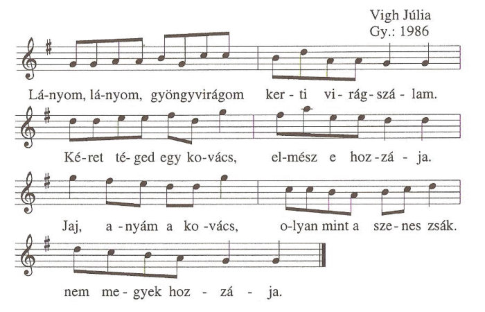 1. Lányom, lányom, gyöngyvirágom, kerti virágszálam,Kéret téged egy kovács, elmész-e hozzája.Jaj, anyám a kovács olyan mint a szenes zsák.Nem megyek...