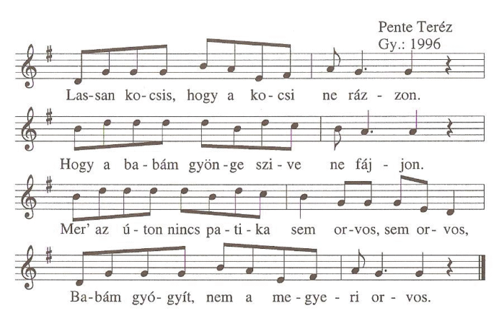 1. Lassan kocsis, hogy a kocsi ne rázzon,Hogy a babám gyönge szíve ne fájjon,Mer az úton nincs patika sem orvos,...