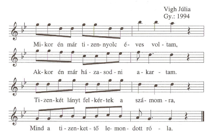 1. Mikor én már tizennyolc éves voltam,Akkor én már házasodni akartam.Tizenkét lányt felkértek a számomra,Mind a tizenkettő lemondott róla.2. Az...